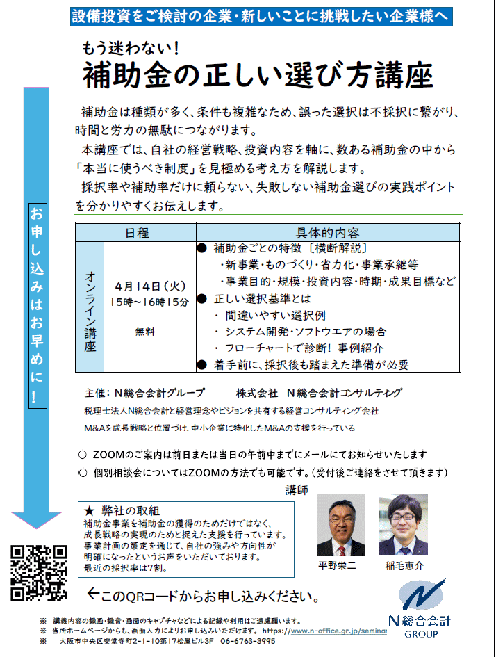 ZOOMによるオンライン講座「もう迷わない!補助金の正しい選び方講座」を開催致します。